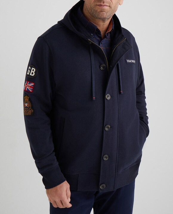 Chaqueta deportiva de hombre azul marino con parches y capucha tallas grandes