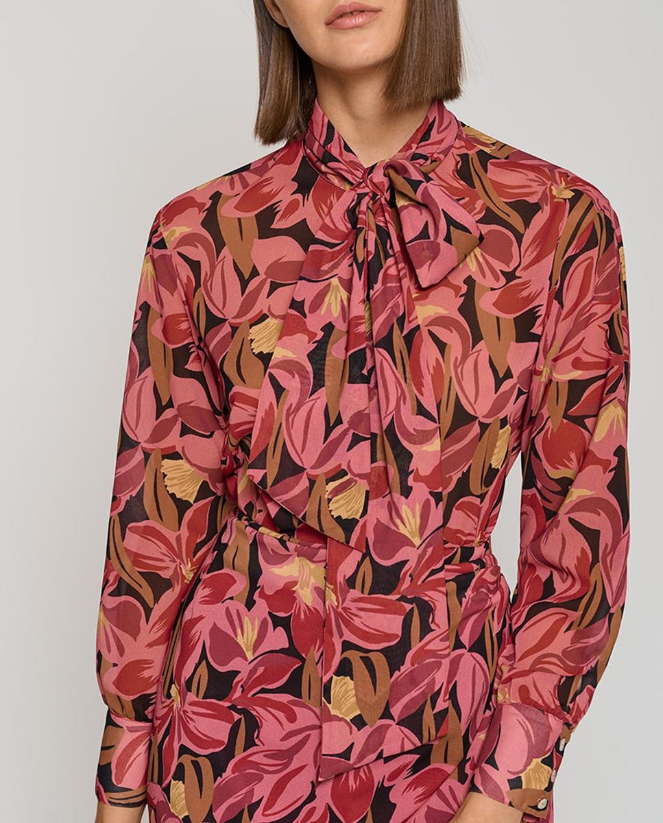 Camisa de mujer manga larga con lazada crepe Georgette floral grande
