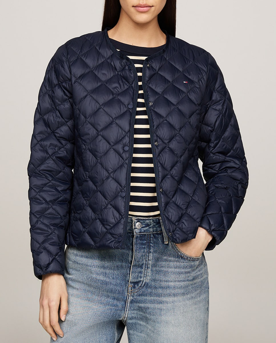 Chaqueta plumífera de mujer con cierre de botones y cuello redondo
