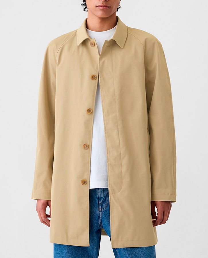 Chubasquero de hombre repelente al agua. Cuello de punta y botón en la parte delantera. Bolsillos inclinados.