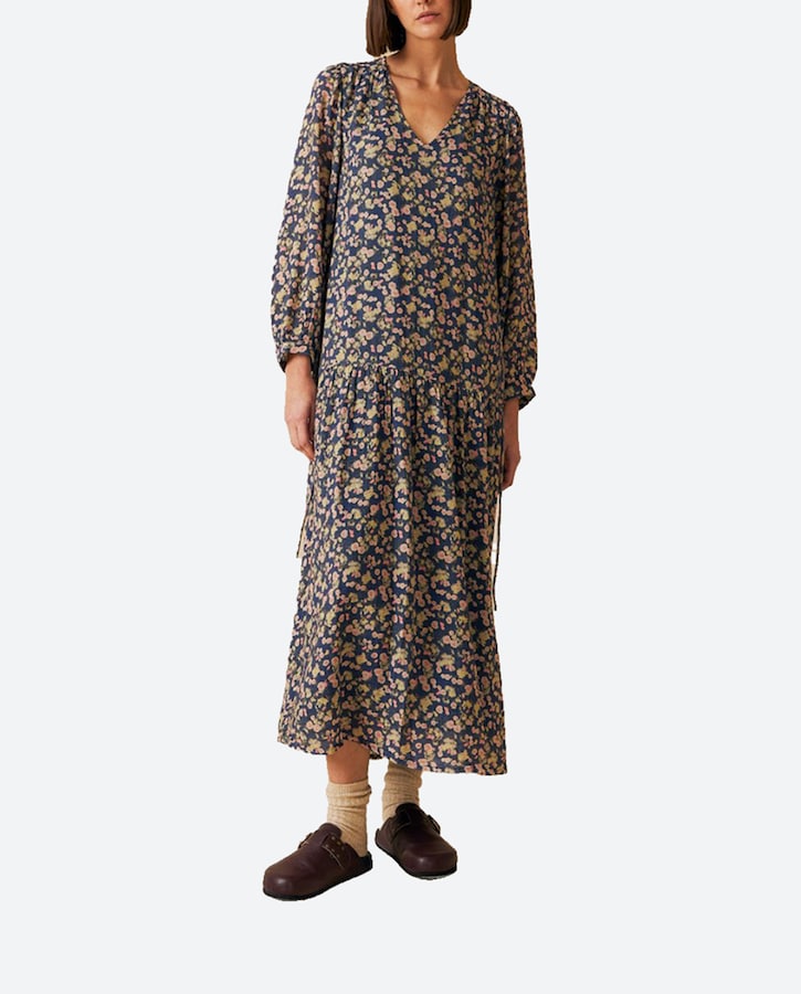 Vestido maxi escote en uve y manga globo