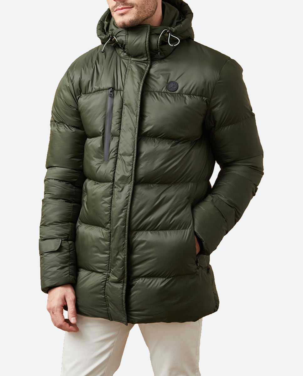 Abrigo de hombre, 3/4 thermolite, capucha, logo engomado en brazo.
