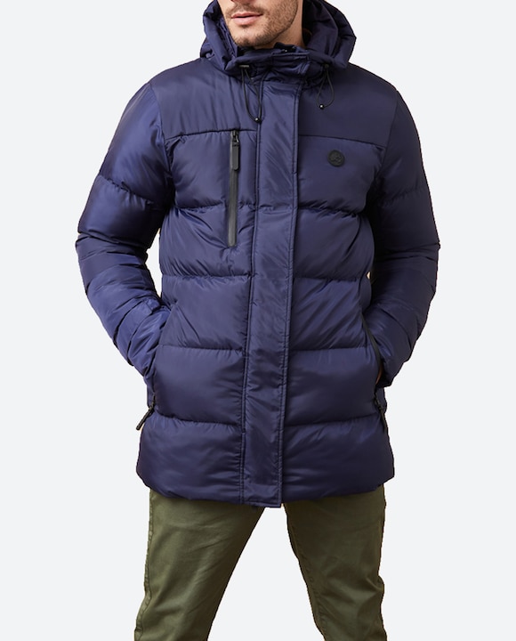 Plumífero de hombre, 3/4 thermolite, capucha, logo engomado en brazo.
