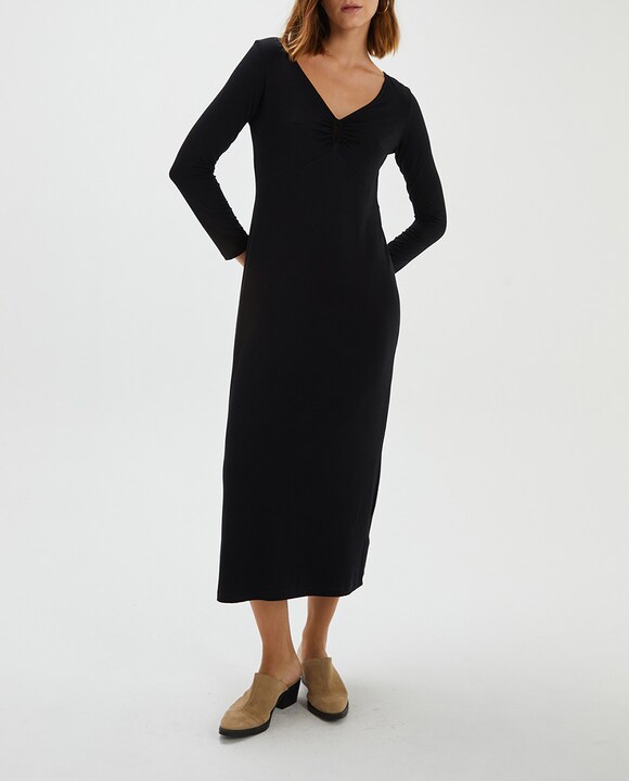 Vestido negro midi fluido detalle cut out delantero de mujer