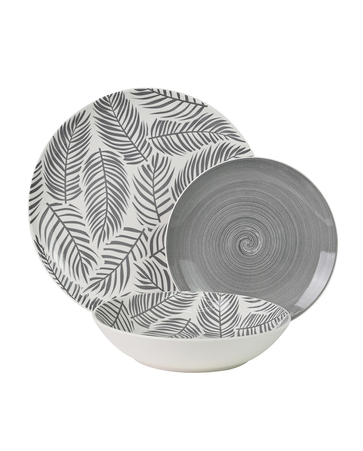 Vajilla 18 pzs porcelana gris hojas, plato llano:ø27cm