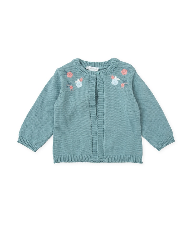 Chaqueta de bebé niña tricot verde mar con flores bordadas