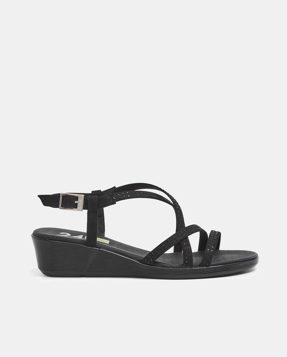 Sandalias de cuña de mujer en nobuck con cristales al tono