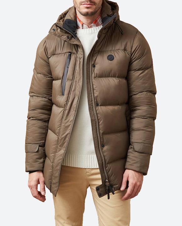 Plumífero de hombre, 3/4 thermolite, capucha, logo engomado en brazo.