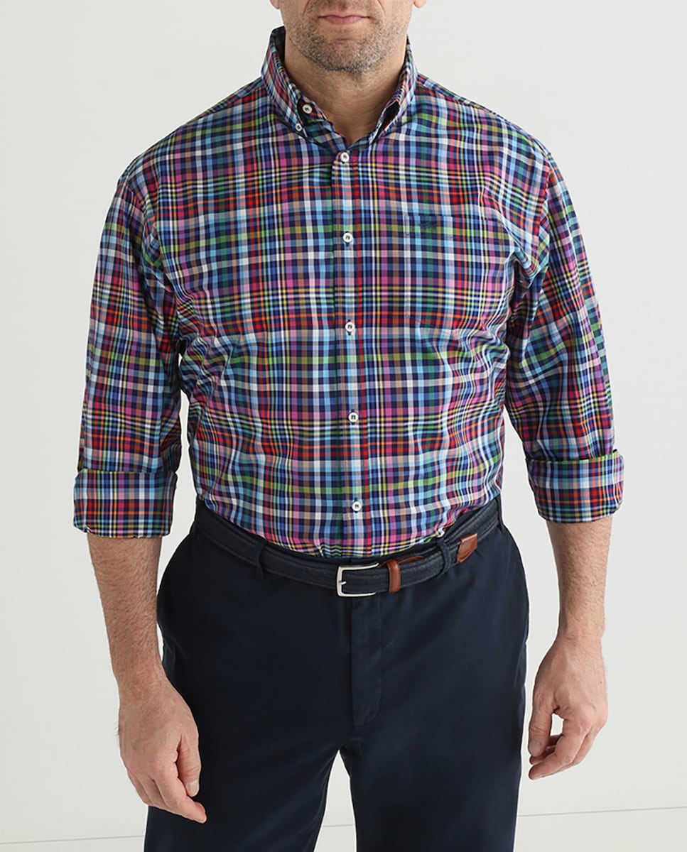 Camisa de popelín de hombre regular cuadros multicolor en fondo azul marino tallas grandes
