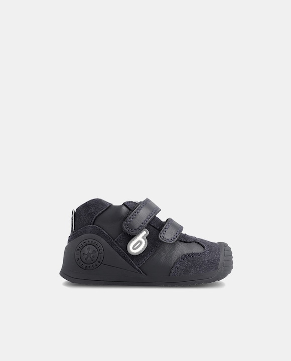 Zapatillas de bebé niño en azul marino bajas de piel con puntera reforzada y cierre adherente