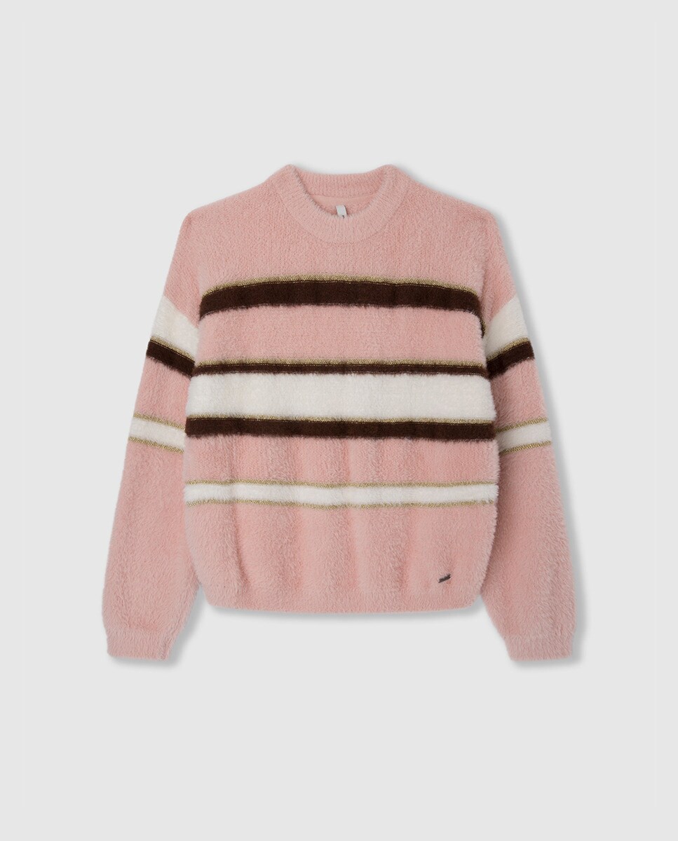 Jersey de niña cuello redondo tejido de chenilla y detalle de rayas en contraste