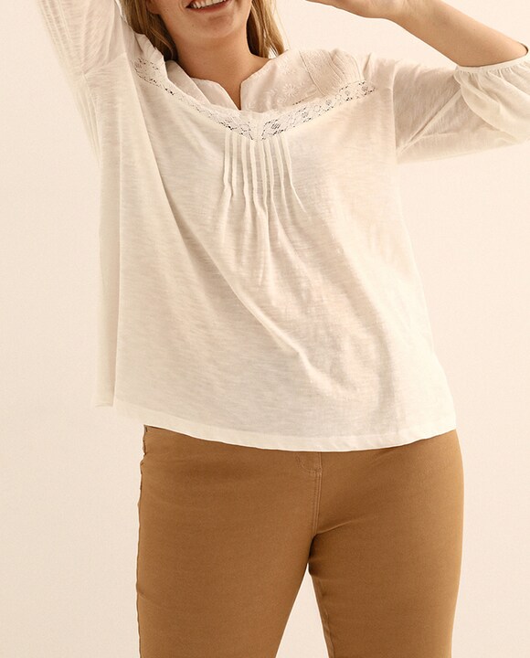 Camiseta de mujer talla grande con bordados y entredoses