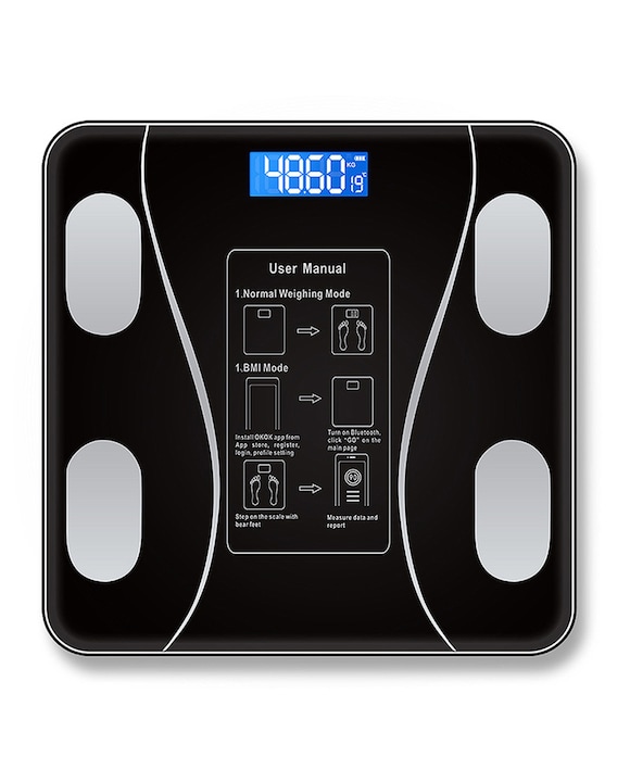 Báscula inteligente con 8 métricas esenciales. Peso, grasa%, IMC, edad corporal, etc.