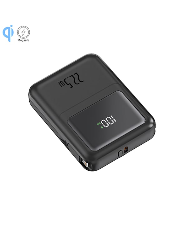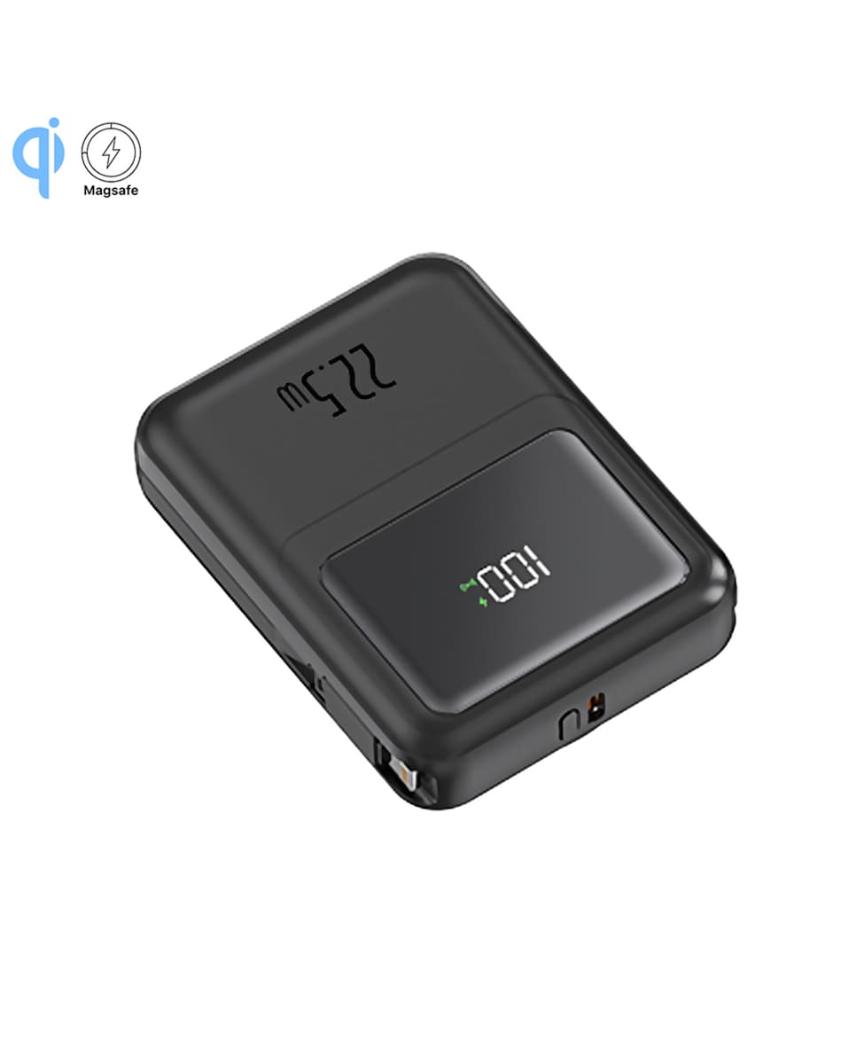 Powerbank 10.000mAh con carga rápida PD22,5W y carga inalámbrica de 15W. Cables USB-C y Lightning integrados. Pantalla led de carga.