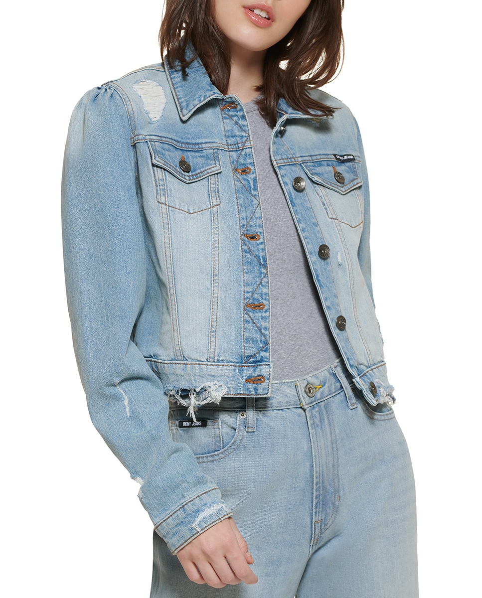 Cazadora vaquera de mujer con cuello camisero y manga larga.
