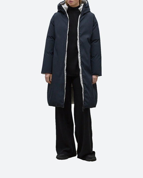 Abrigo acolchado de mujer con cierre de cremallera capucha y bolsillos laterales.