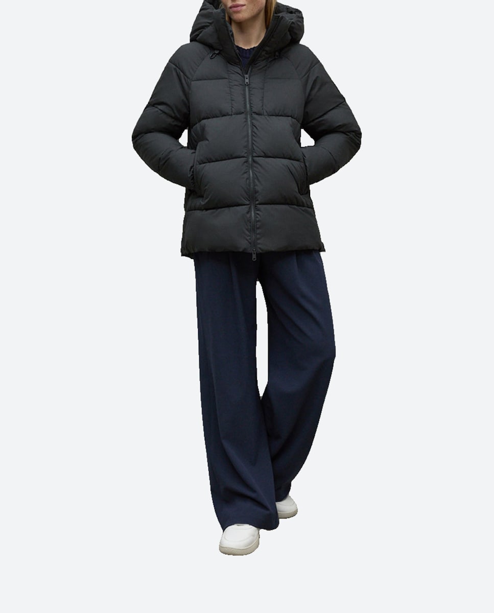 Chaqueta acolchada de mujer con cierre de cremallera capucha y bolsillos laterales.