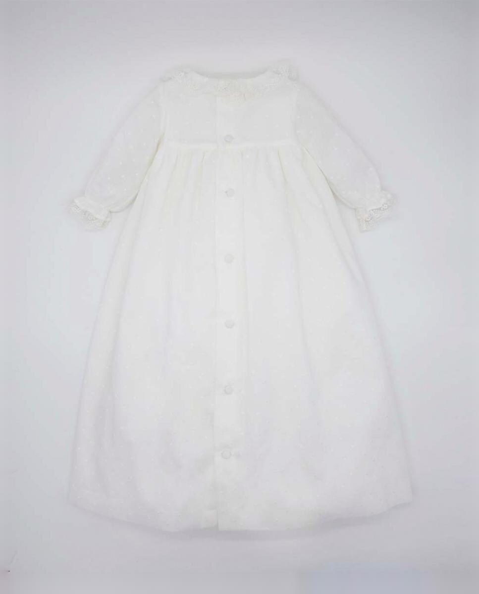 Faldón de bautizo de muselina bordada . Volante en el cuello y puntilla en el pecho y puños.