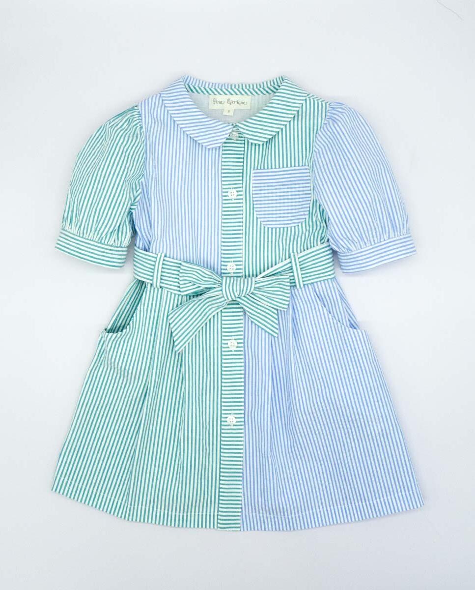 Vestido de manga corta combinado raya y . Bolsillos, cuello y cinturon. Botones en el centro.