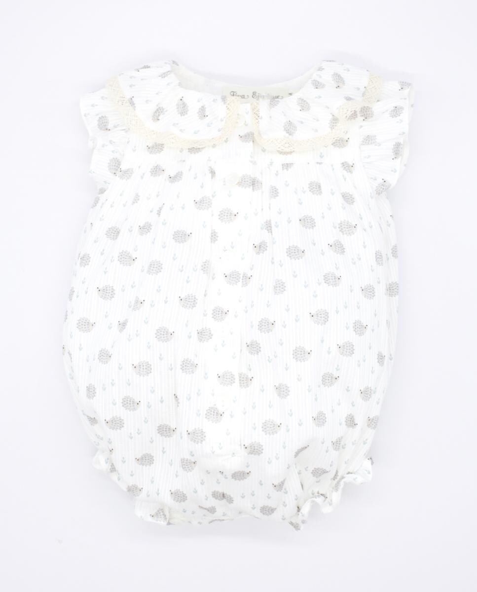 Pelele estampado de erizos, con volante en el cuello y en la sisa.