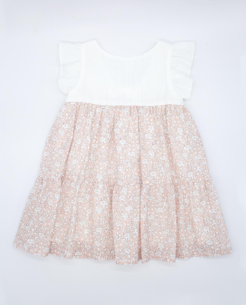 Vestido con el cuerpo en y falda estampada de flores albaricoque. Con volantes en las sisas, falda fruncida de volantes.