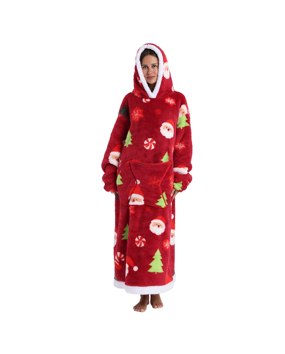 Bata estilo sudadera y manta de felpa extrasuave Triple bolsillo frontal tipo canguro Diseño navideño tipo largo