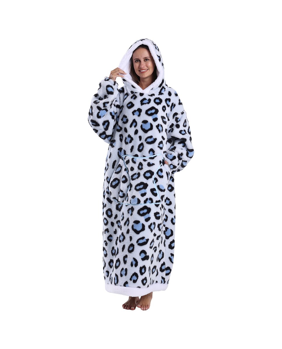 Bata estilo sudadera y manta de felpa extrasuave Triple bolsillo frontal tipo canguro Diseño leopardo blanco tipo largo