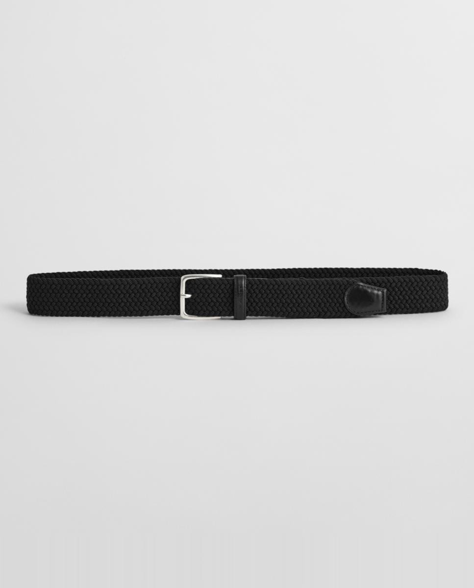 Cinturón trenzado de hombre en material flexible con detalles de piel, hebilla metálica.