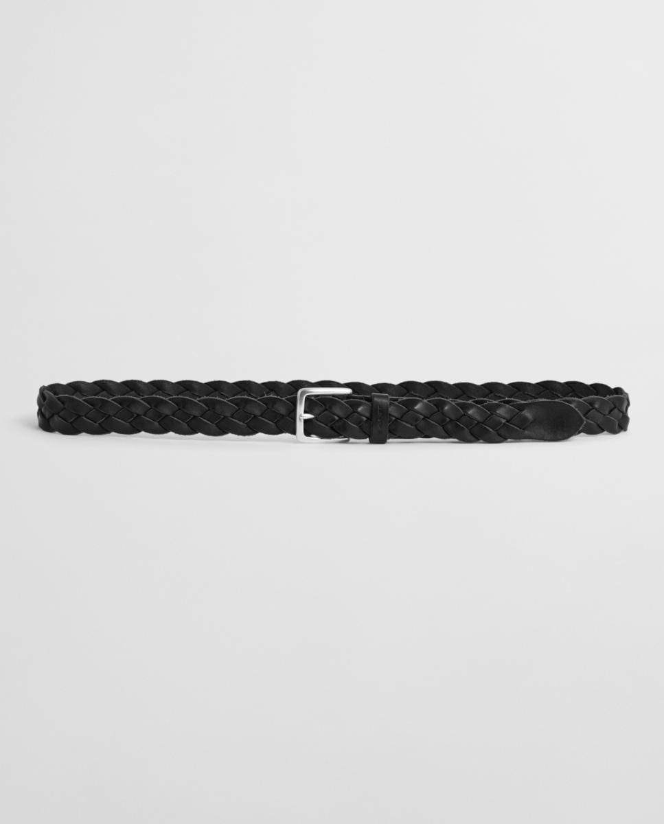 Cinturón trenzado de hombre en material flexible con detalles de piel, hebilla metálica y diseño versátil.