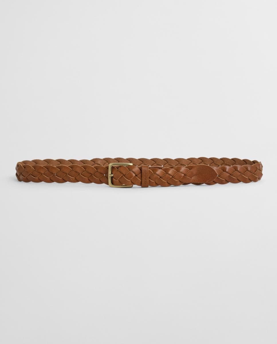 Cinturón trenzado de hombre en material flexible con detalles de piel, hebilla metálica y diseño versátil.
