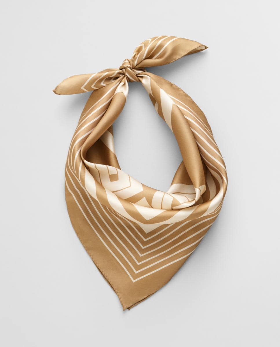 Pañuelo de mujer de seda con estampado geométrico y acabado brillante.