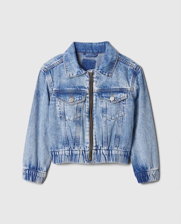 Cazadora vaquera de niña con cuello abierto y cremallera en la parte delantera