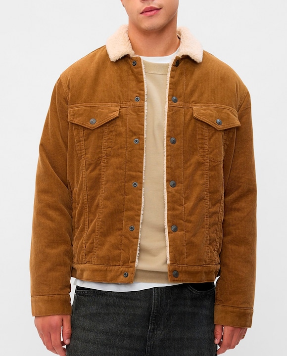 Cazadora de hombre lisa de pana forrada de sherpa con cuello abierto y botones en la parte delantera