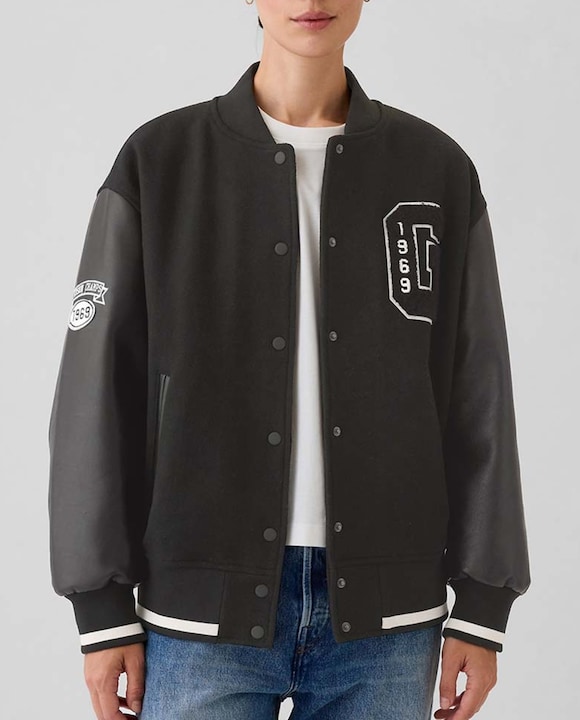 Cazadora de mujer universitaria de manga larga con logotipo universitario en la parte delantera y en la manga