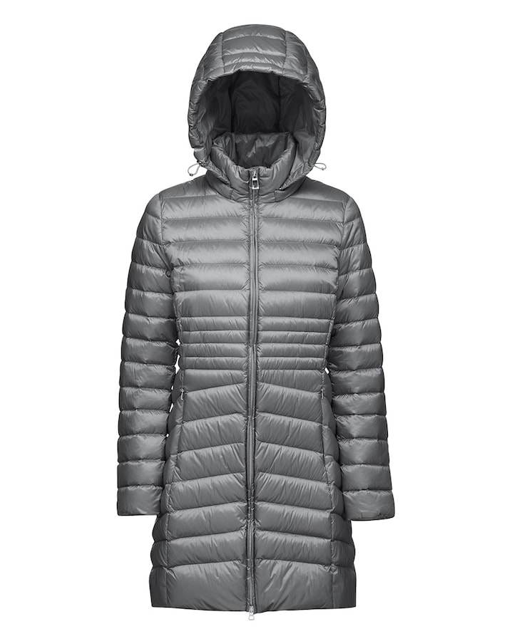 Plumifero acolchado largo de mujer con capucha desmontable