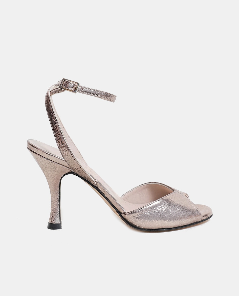 Sandalias de mujer en color oro con pulsera al tobillo y tacón de aguja