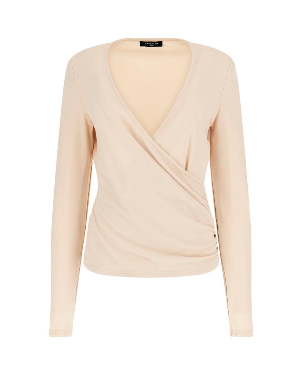 Top crema de manga larga con escote cruzado de mujer