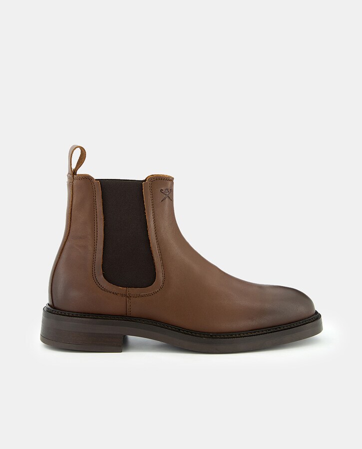Botines de hombre en marrón tipo chelsea de piel con logotipo grabado y suela de goma