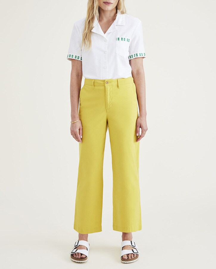 Pantalón chino de mujer con cintura alta pierna ancha y largo hasta el tobillo Tejido ligero de algodón y lino