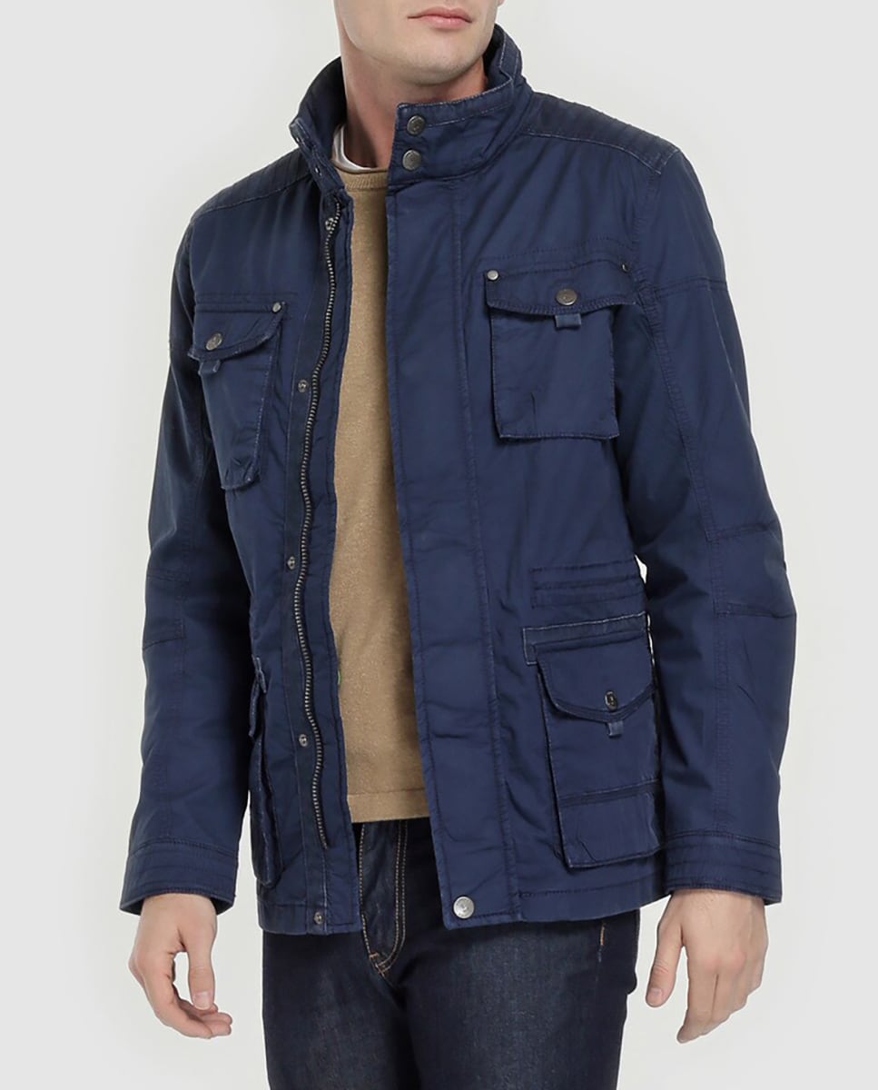 Chaqueta de abrigo de hombre azul con cuatro bolsillos