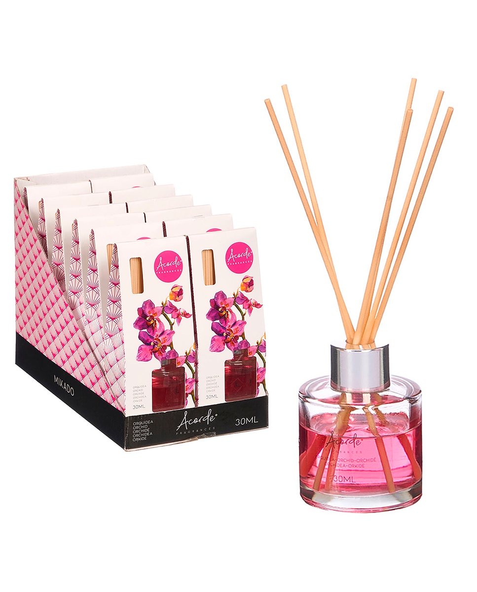 Pack 12 mikados con olor a orquídea. Frasco de 30ml y 6 varillas de fragancia.