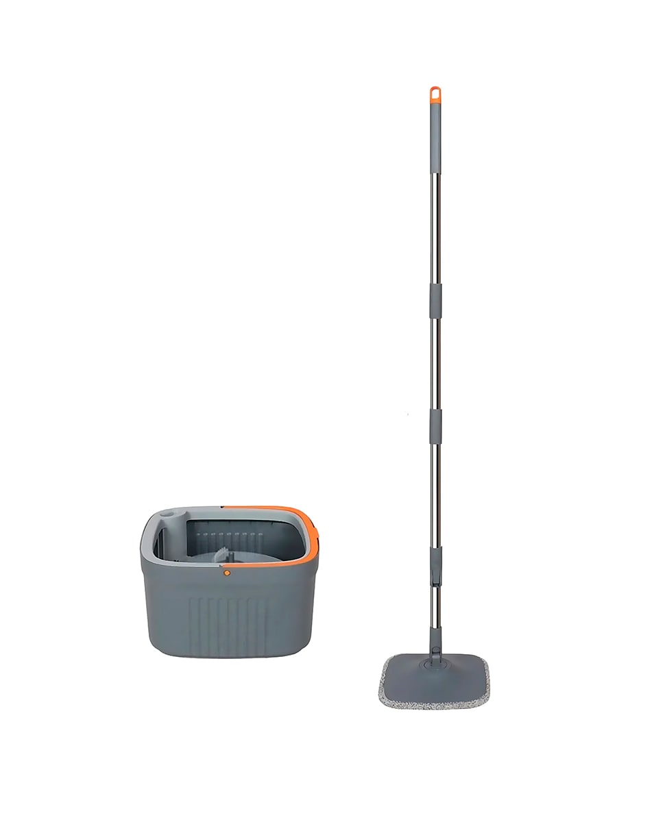 Mopa giratoria con cubo de separación de agua limpia y sucia, sistema manos libres y cabezal 360°. Apta para limpieza en seco y húmedo.