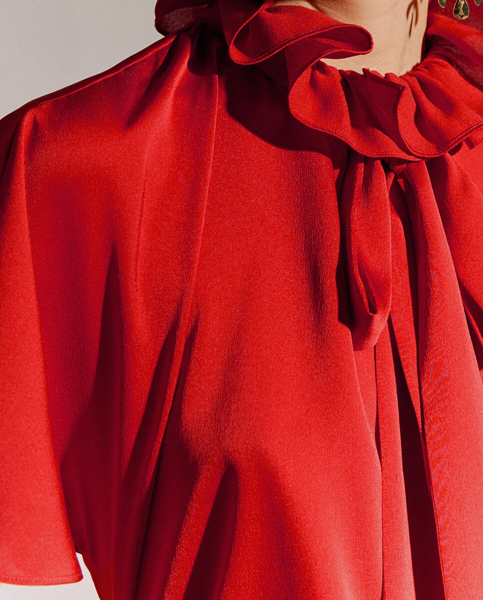 Blusa manga corta con volante y cuello lágrima