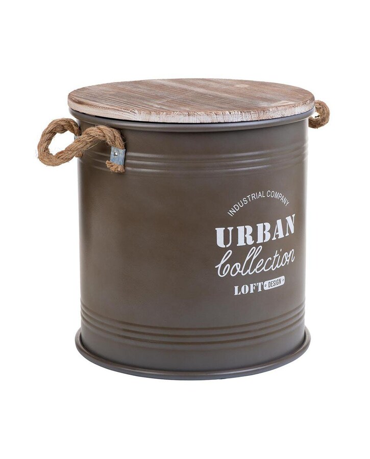 Caja redonda de metal, tapa de madera y asas de cuerda impresa gris