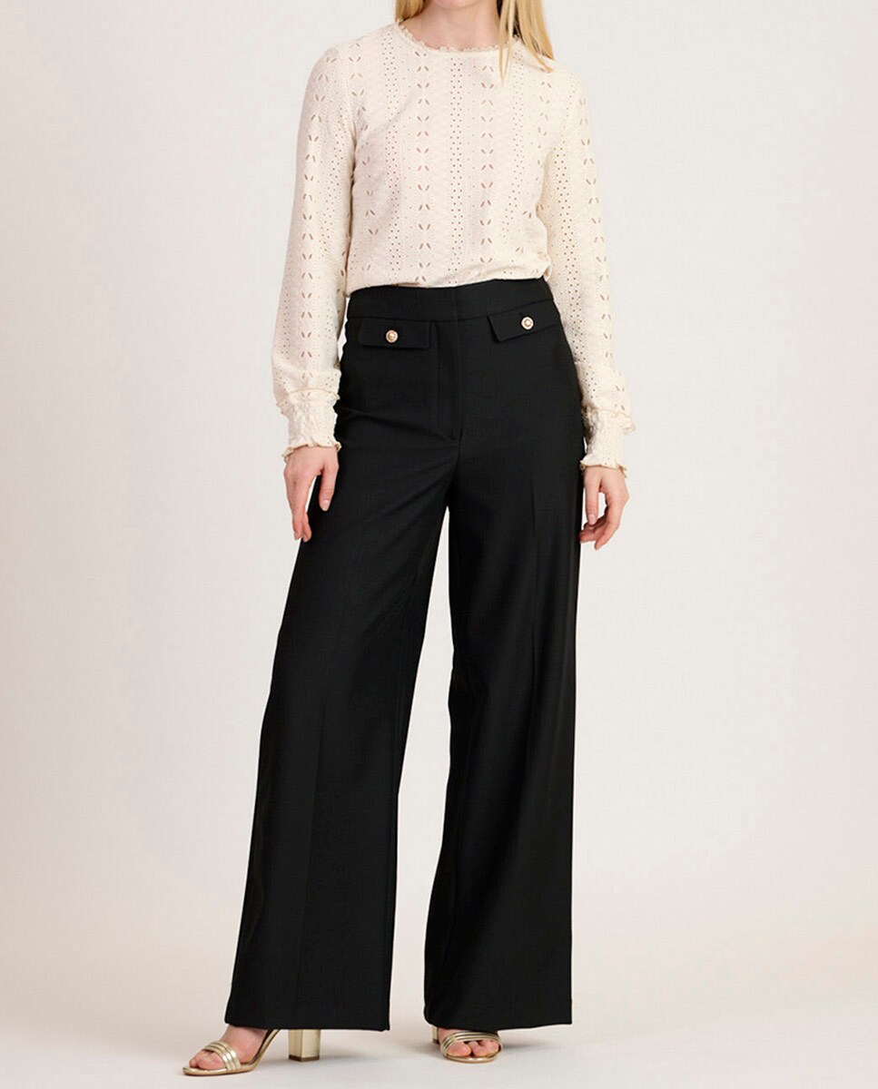 Pantalón de mujer de vestir con detalle de tapetas con botón maxi dorado en la parte delantera
