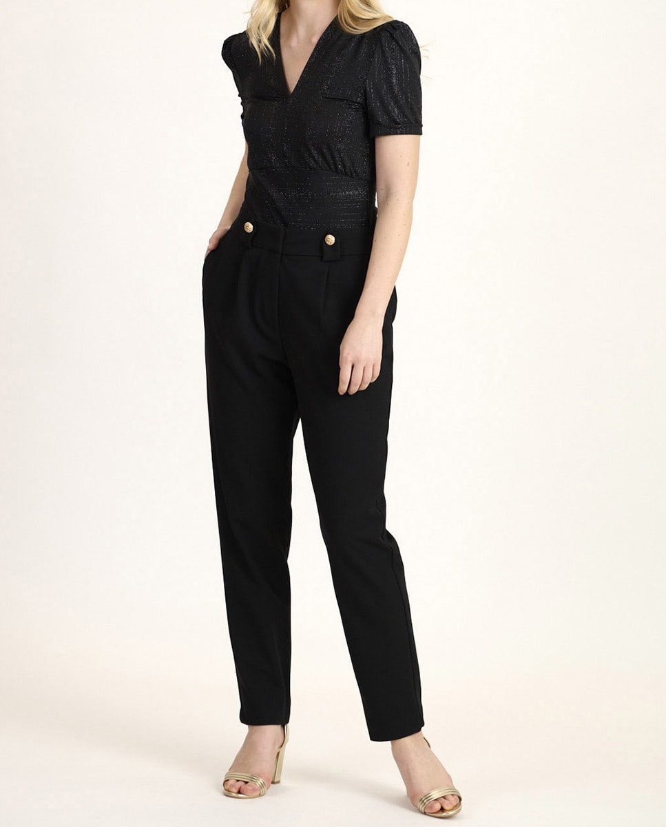 Pantalón de mujer de traje con detalle de dos botones en las trabillas delanteras