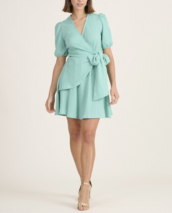 Vestido de mujer corto con cuello pico cruzado y atado con maxi lazo en la cintura