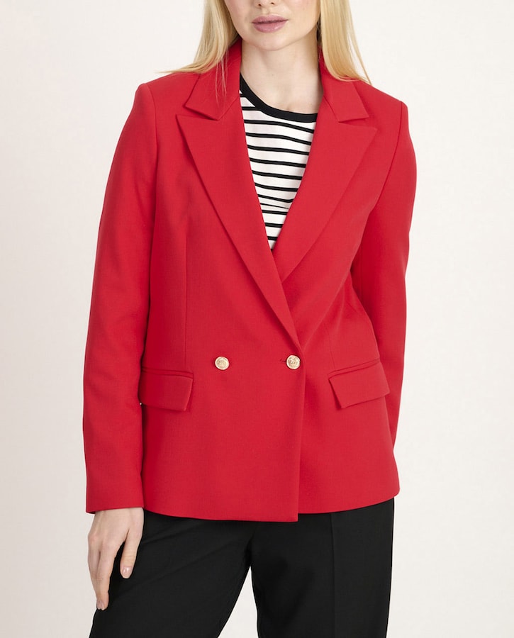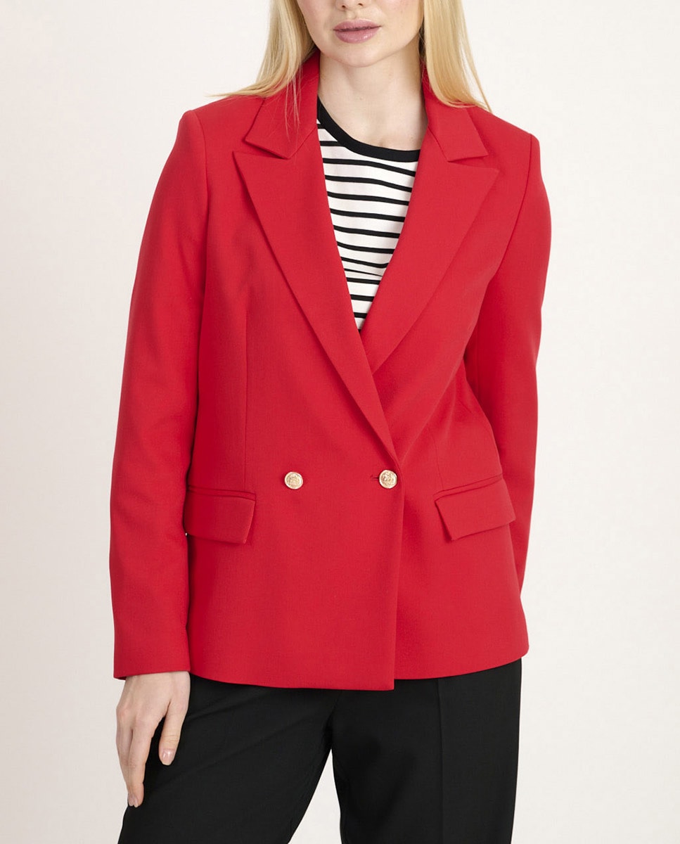 Americana de mujer larga con cuello solpa y cierre cruzado con botones dorados