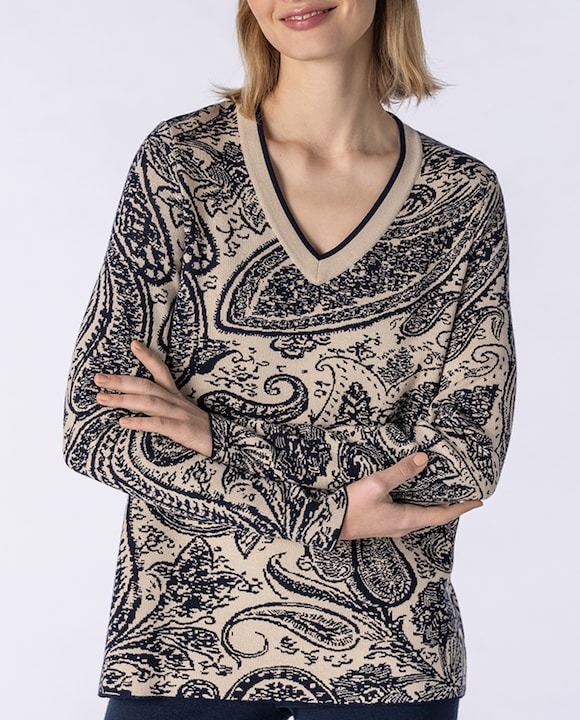 Jersey de mujer de punto con estampado paisley de manga larga y cuello pico