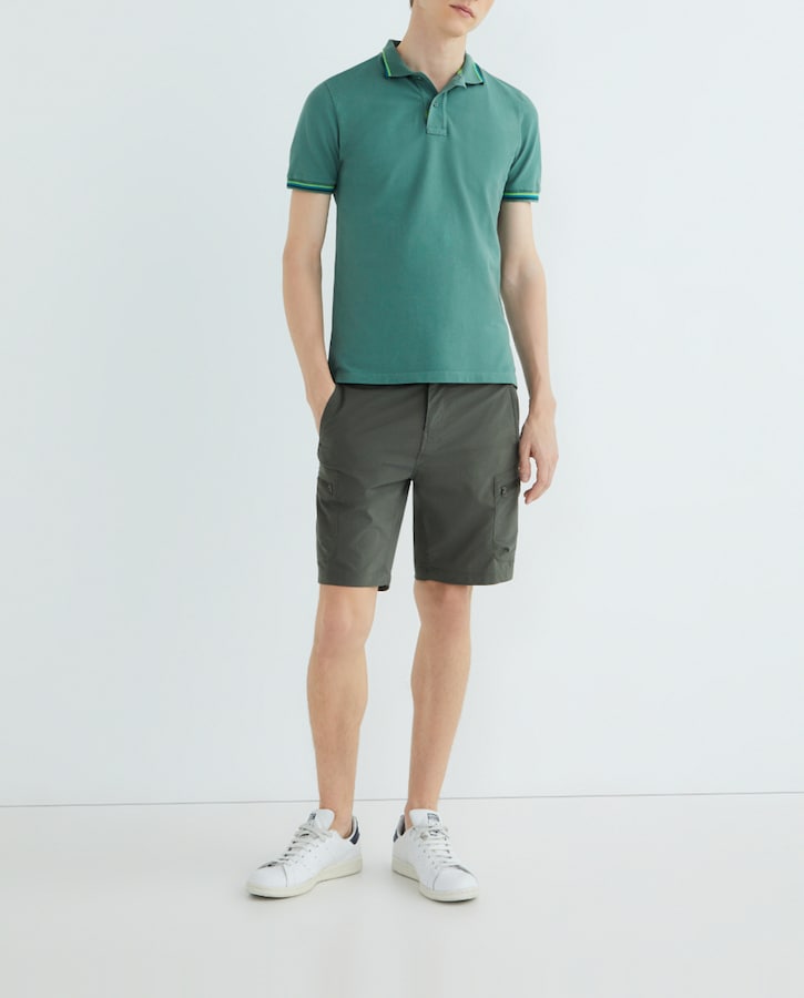 Polo liso cuello acanalado y puños de manga con rayas tricolor